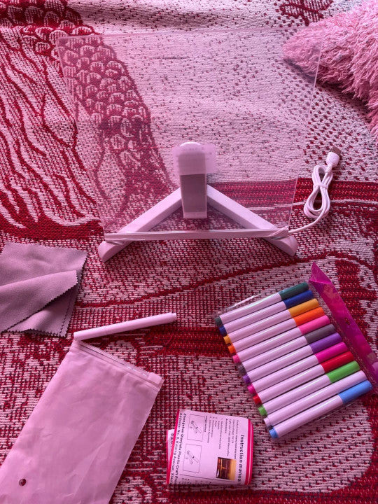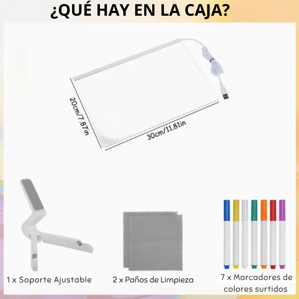 Es una pizarra acrílica iluminada por luz LED que permite escribir y dibujar con marcadores especiales. Al encenderla, los trazos se ven brillantes y llamativos, ideal para escritorio, decoración, estudio o negocios.
