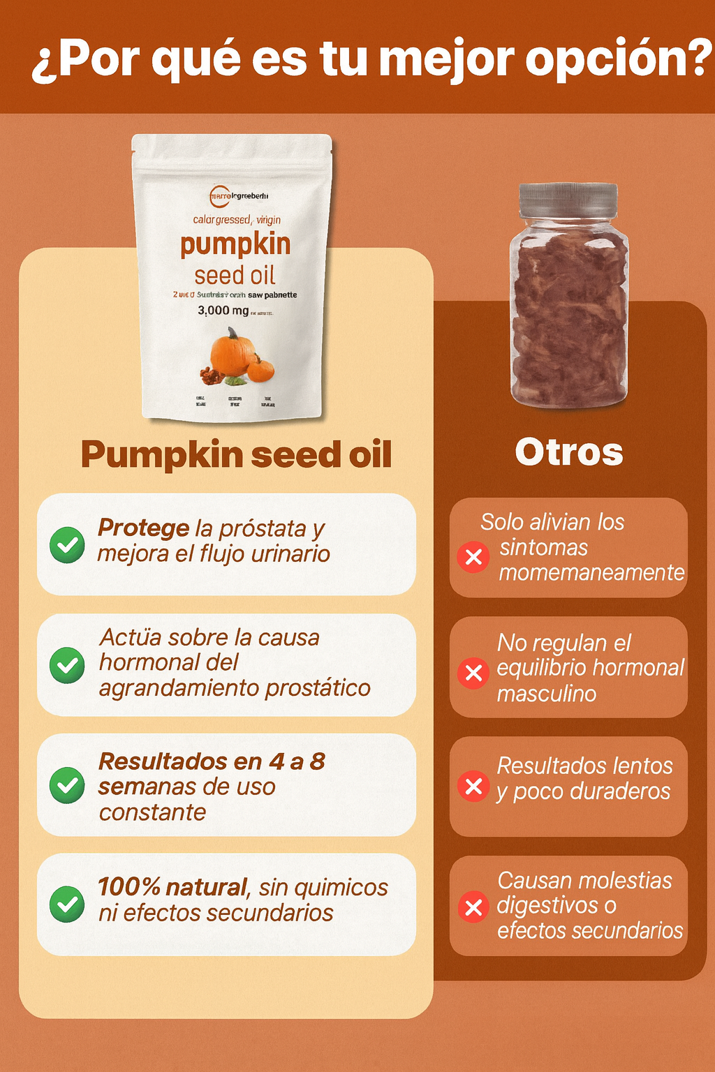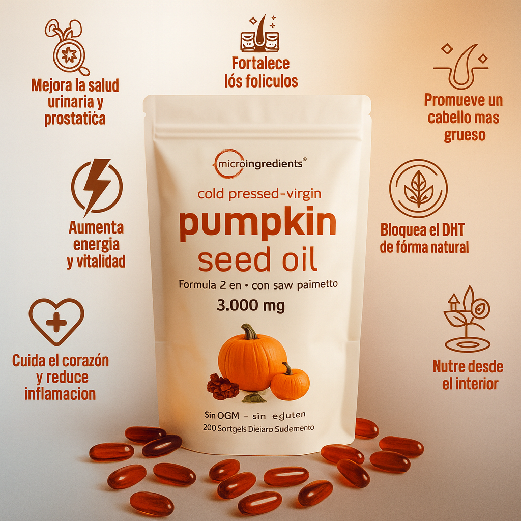 El Aceite de Semilla de Calabaza es un suplemento natural que contiene una alta concentración de ácidos grasos esenciales, antioxidantes y zinc. Ayuda a mejorar la salud prostática, a promover el crecimiento capilar y a fortalecer el sistema inmunológico.
