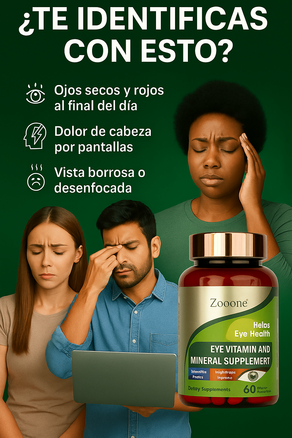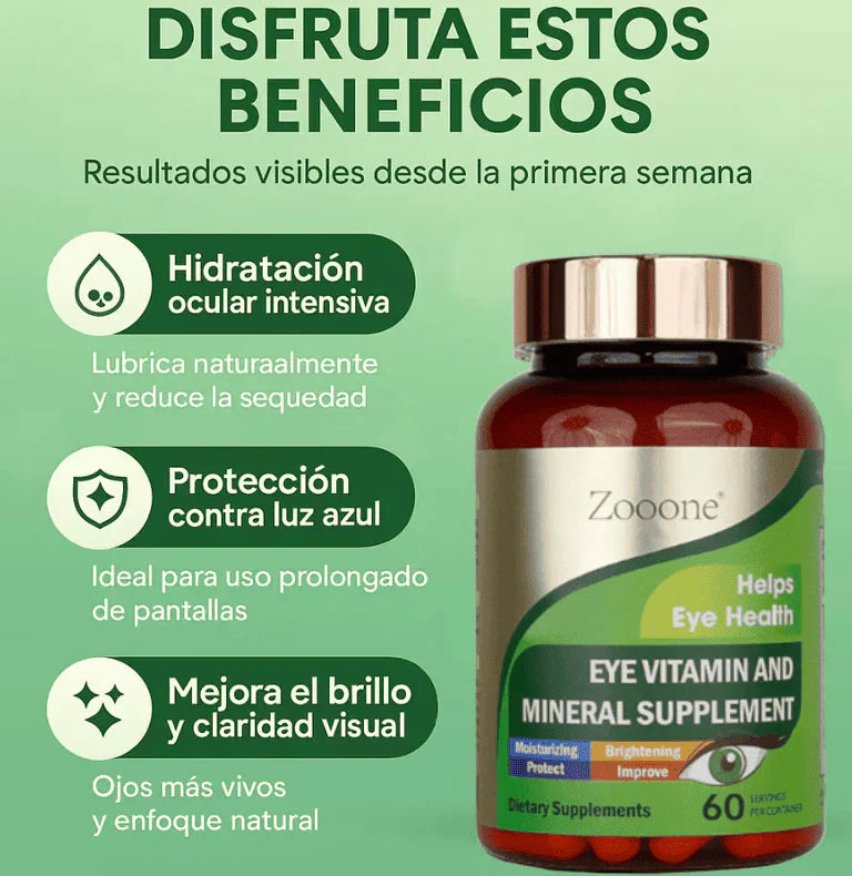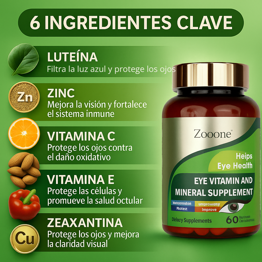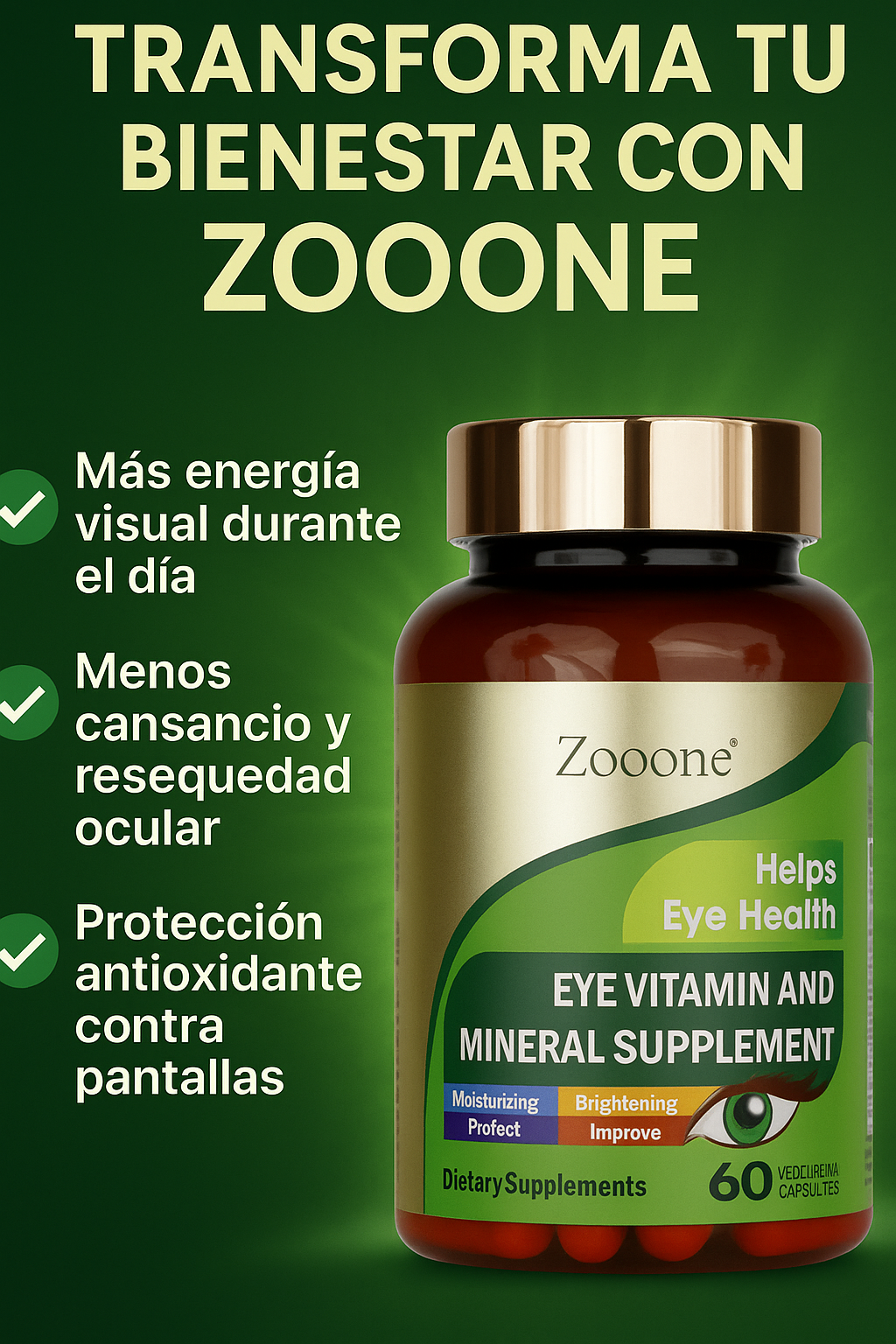 Zooome es un suplemento nutricional diseñado para proteger y fortalecer la salud visual. Su fórmula combina luteína, zeaxantina, zinc y vitaminas antioxidantes (C y E) que ayudan a mantener una visión clara y saludable frente al paso del tiempo y el uso intensivo de pantallas.